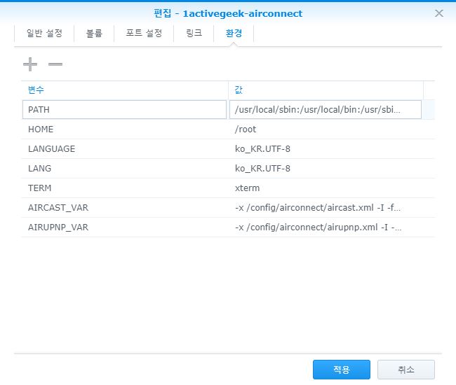Synology에는 package로 설치할 수 도 있고 Docker로(https://github.com/1activegeek/docker-airconnect)설치하여 컨테이너를 만들 수 있다.