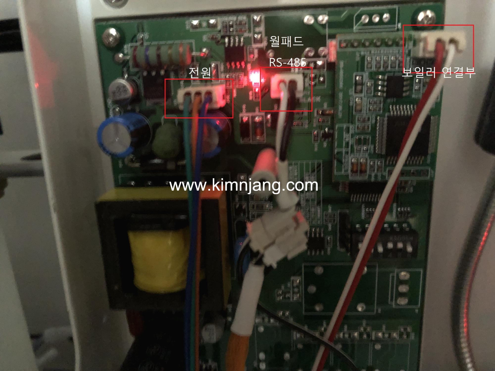 왼쪽 사진은 코콤 월패드를 분리하면 뒷면에 보이는 월패드 IO 보드이다. 오른쪽 상단에 여러개의 선이 한군데로 연결되는 부분이 RS-485 연결부이며 이곳에 새로운 선을 브릿지하면 PC나 다른 장치에서 월패드의 RS-485 패킷을 캡쳐할 수 있다.